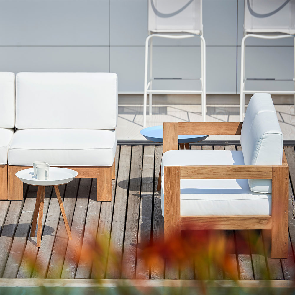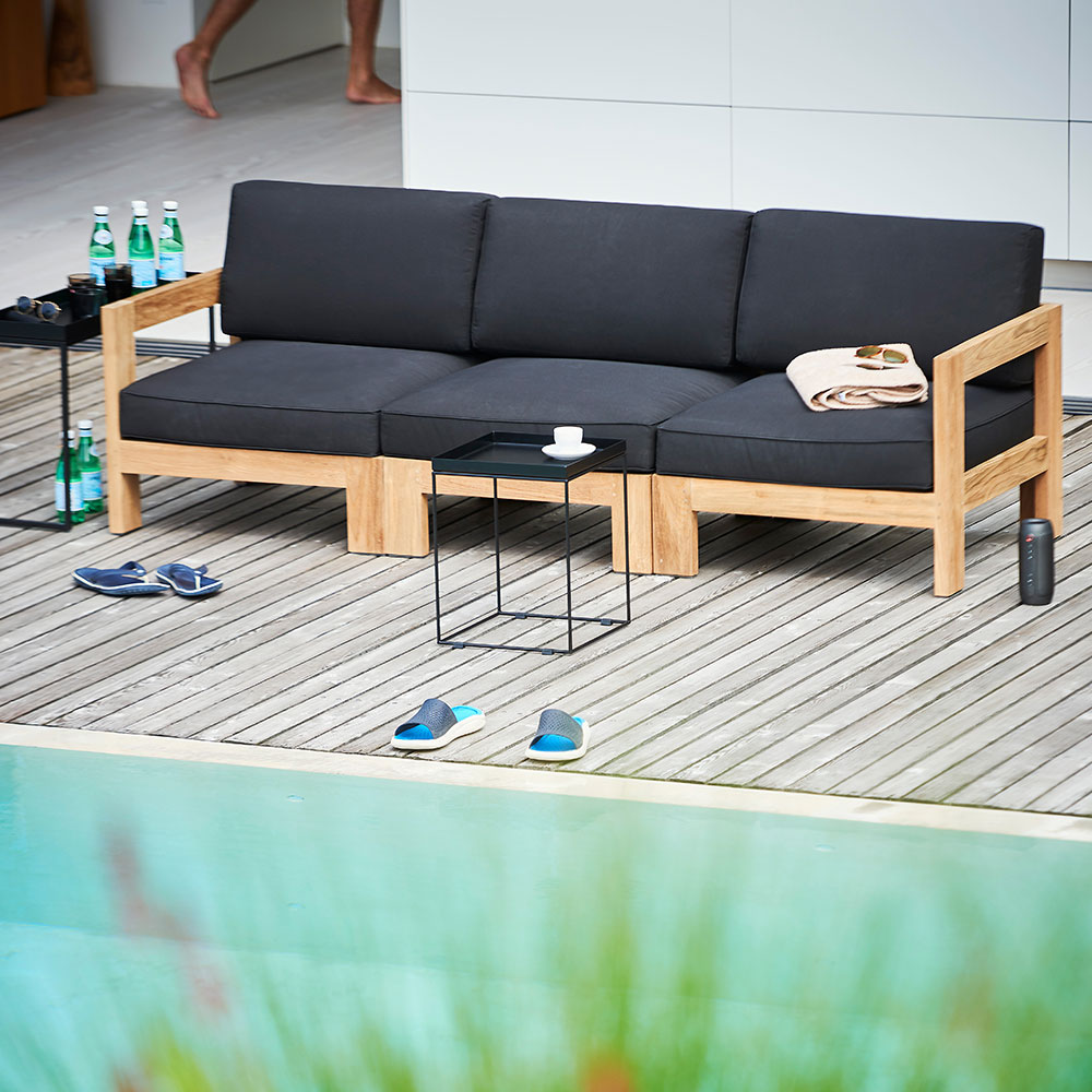 Die Lounge kann individuell zusammengestellt werden, die Module bestehen aus einem Eckelement und einem Mittelelement.